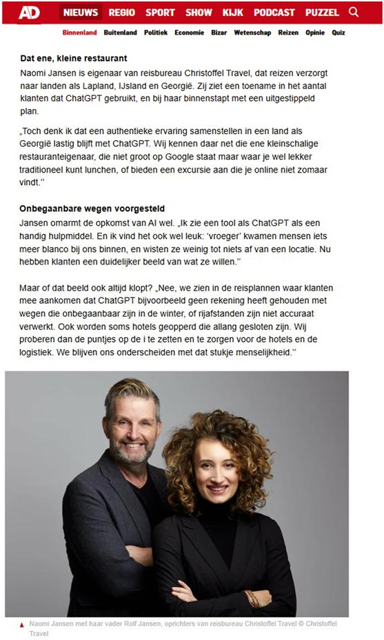 In het Algemeen Dagblad verscheen een mooi artikel over de opkomst van AI bij het plannen van maatwerkreizen. Steeds meer reizigers stappen met een voorstel van tools als ChatGPT bij ons binnen. Een waardevolle ontwikkeling, want AI kan inspireren. Maar zoals we in het interview toelichten: een écht unieke reis vraagt om menselijke kennis, ervaring en persoonlijke aandacht – dat blijft onze kracht.