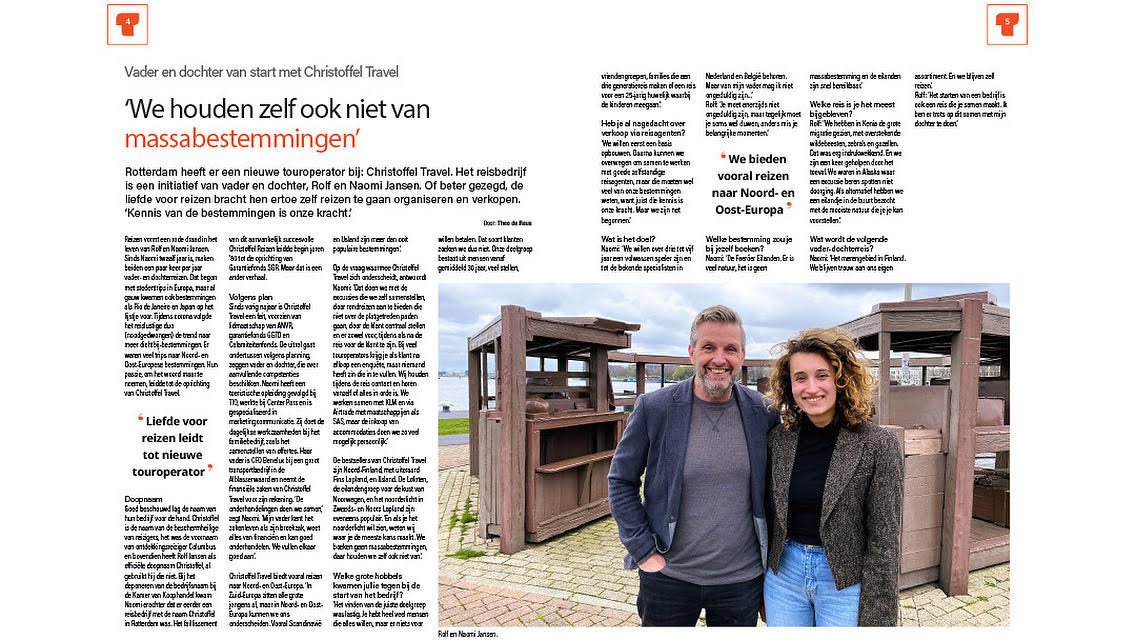 Theo de Reus, redacteur van het Nederlandse Travmagazine, sprak met Rolf en Naomi Jansen in een interview over Christoffel Travel. Rotterdam heeft er een nieuwe touroperator bij: Christoffel Travel. Het reisbedrijf is een initiatief van vader en dochter, Rolf en Naomi Jansen. Of beter gezegd, de liefde voor reizen bracht hen ertoe zelf reizen te gaan organiseren en verkopen. ‘Kennis van de bestemmingen is onze kracht’.