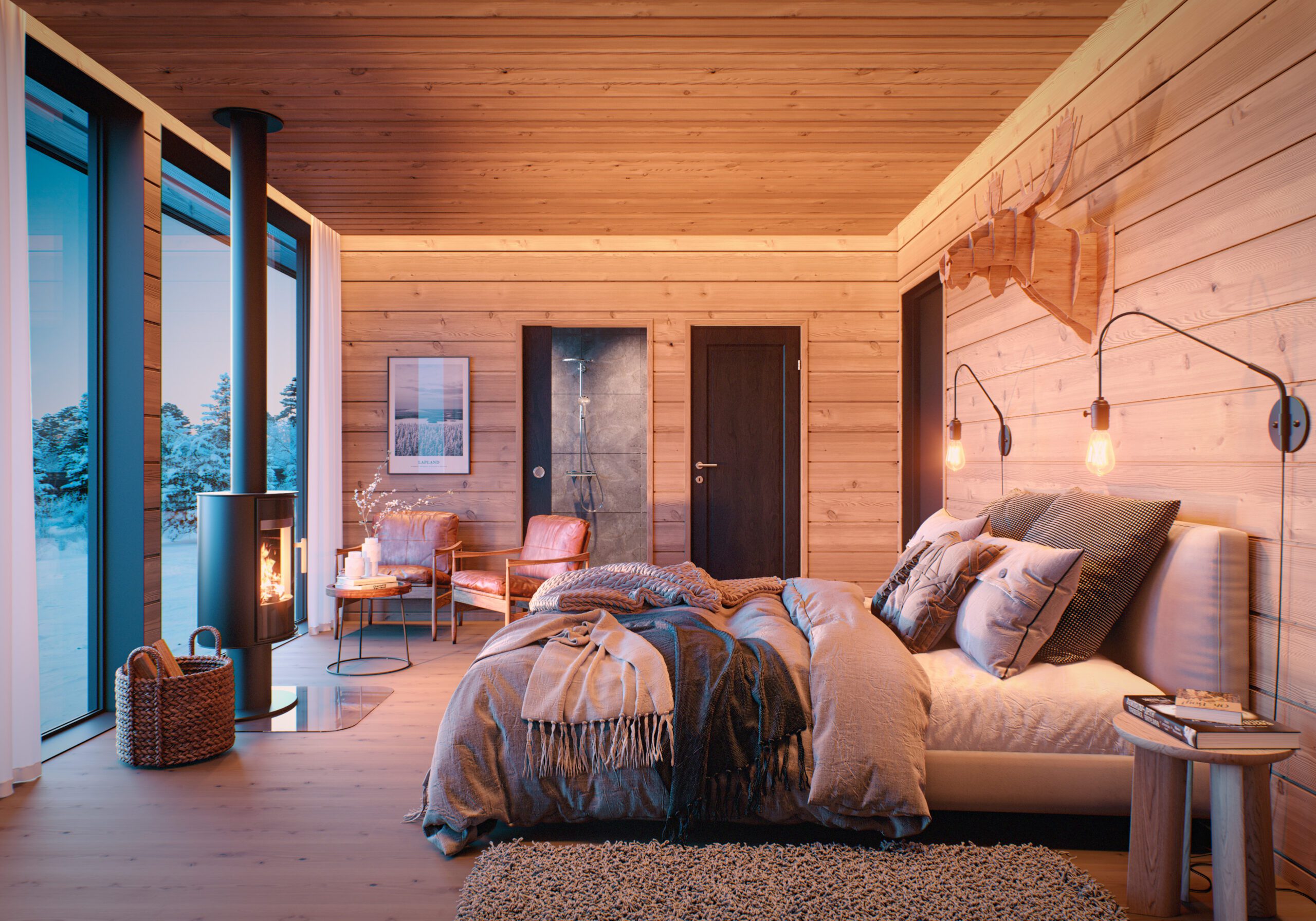 Arctic Sky Villa’s met een slaapkamer, woonkamer met open haard en badkamer met bad en sauna.