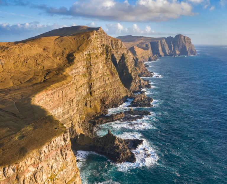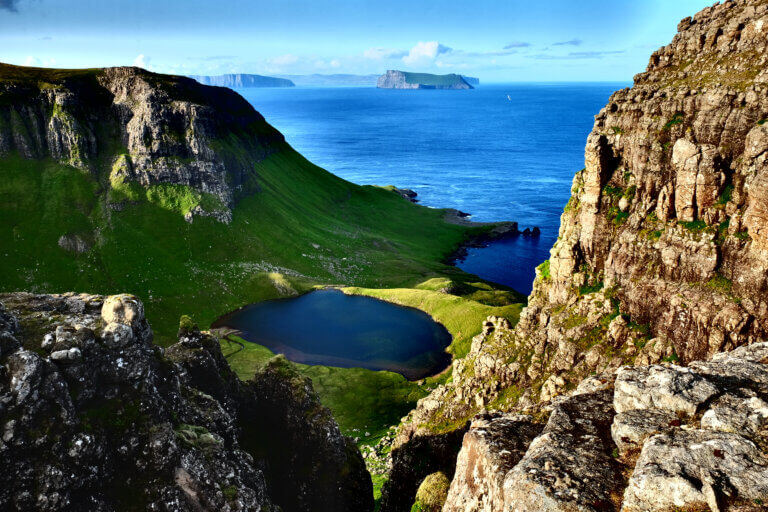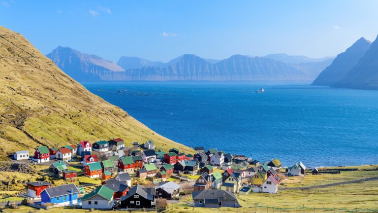 Bij een bezoek aan de Faeröer bent u nooit meer dan 5 km van de oceaan verwijderd. Het landschap wordt gedomineerd door steile bergen en er zijn ongeveer 80.000 schapen en zo’n 2 miljoen paren zeevogels, waaronder de grootste kolonie stormvogels ter wereld, papegaaiduikers en jan-van-genten.