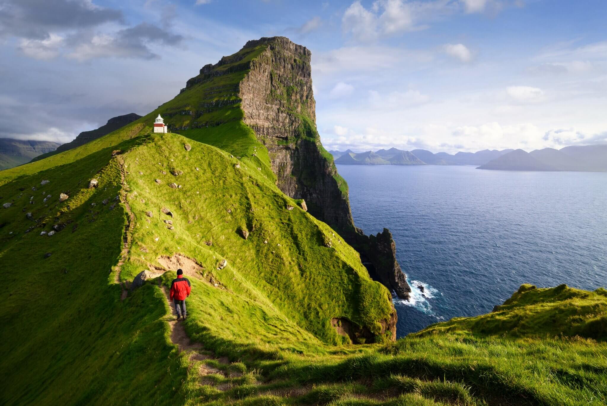 Kalsoy, dat als een vinger in de Noord-Atlantische Oceaan duikt, heeft de bijnaam “de fluit” vanwege zijn lange, slanke vorm en de tunnels die erdoorheen zijn gegraven voor de weg, die van elke rit hier een avontuur maken. Ruig en gehuld in alle denkbare tinten groen is dit één van de meest dramatische en raadselachtige eilanden van de noordelijke keten. Er is geen betere manier om de natuurlijke pracht van dit eiland te bewonderen dan tijdens de rondwandeling naar de vuurtoren van Kallur, die eruitziet alsof hij bij het minste zuchtje adem van de rotswand zou worden geblazen.