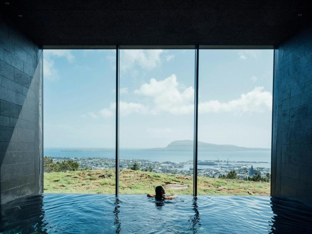 Ontworpen door bekende Deens architecten biedt het hotel stijlvol comfort verscholen in de uitgestrekte natuur van de Faeroer. Het heeft een schitterende ligging in een vallei. Met een dak bedekt door gras valt het prachtig weg in de groene omgeving en biedt het een geweldig panoramisch uitzicht op het omliggende natuurschoon.