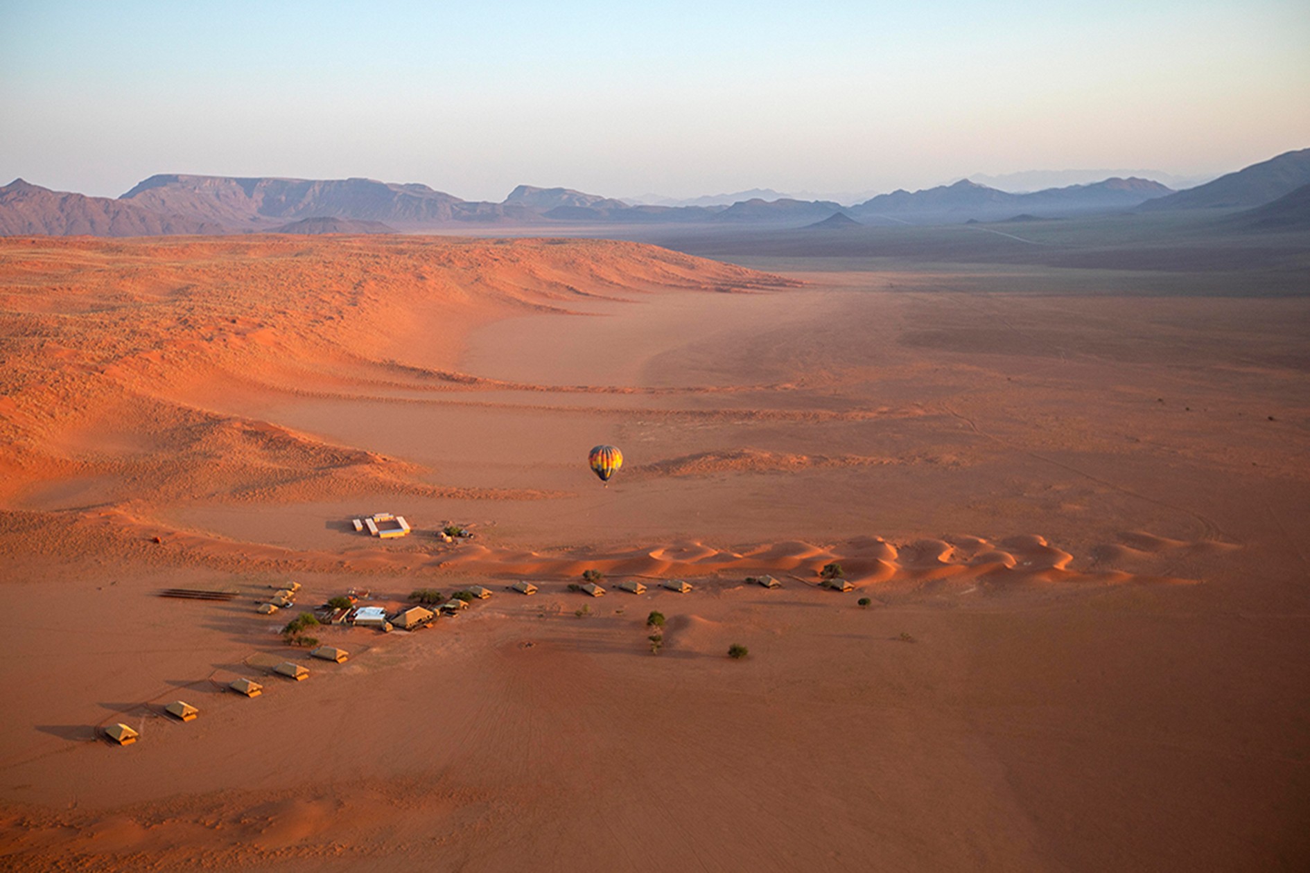 Na een ontbijt met uitzicht op grazende dieren en een ontwakende savanne begint de reis naar het zuiden. De verharde wegen maken langzaam plaats voor gravel, terwijl het landschap verandert in een zee van rood zand en droge vlaktes. Onderweg kom je langs dorpjes, bergpassen en uitgestrekte woestijnvlaktes. In de namiddag arriveer je bij Kwessi Dunes Lodge, gelegen midden in het adembenemende NamibRand Nature Reserve. Je ruime chalet beschikt over een aparte star gazer-kamer zonder dak, zodat je ’s nachts rechtstreeks onder een van de helderste sterrenhemels ter wereld slaapt. Bij zonsondergang kleuren de duinen koper, goud en oranje, een onvergetelijk schouwspel.