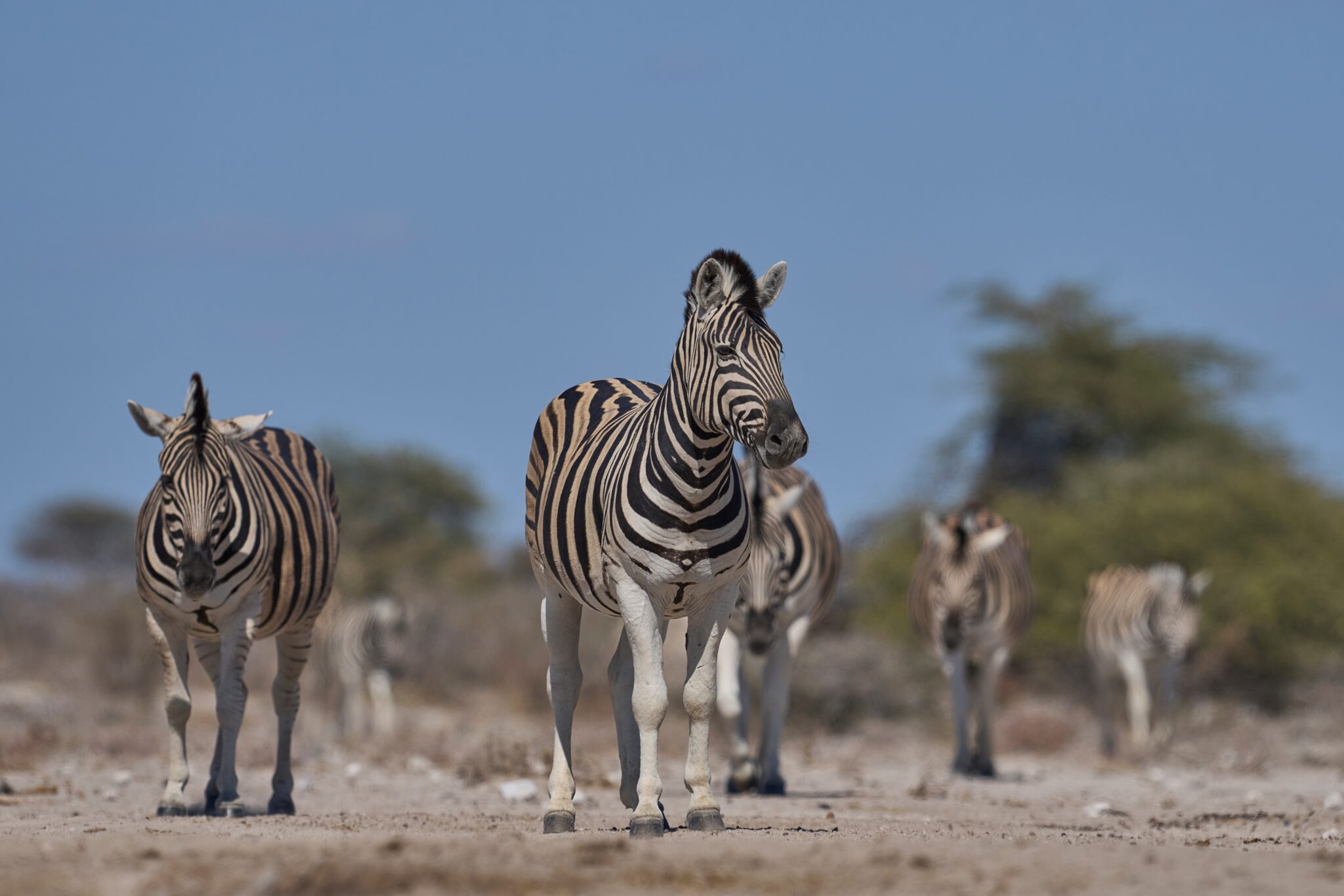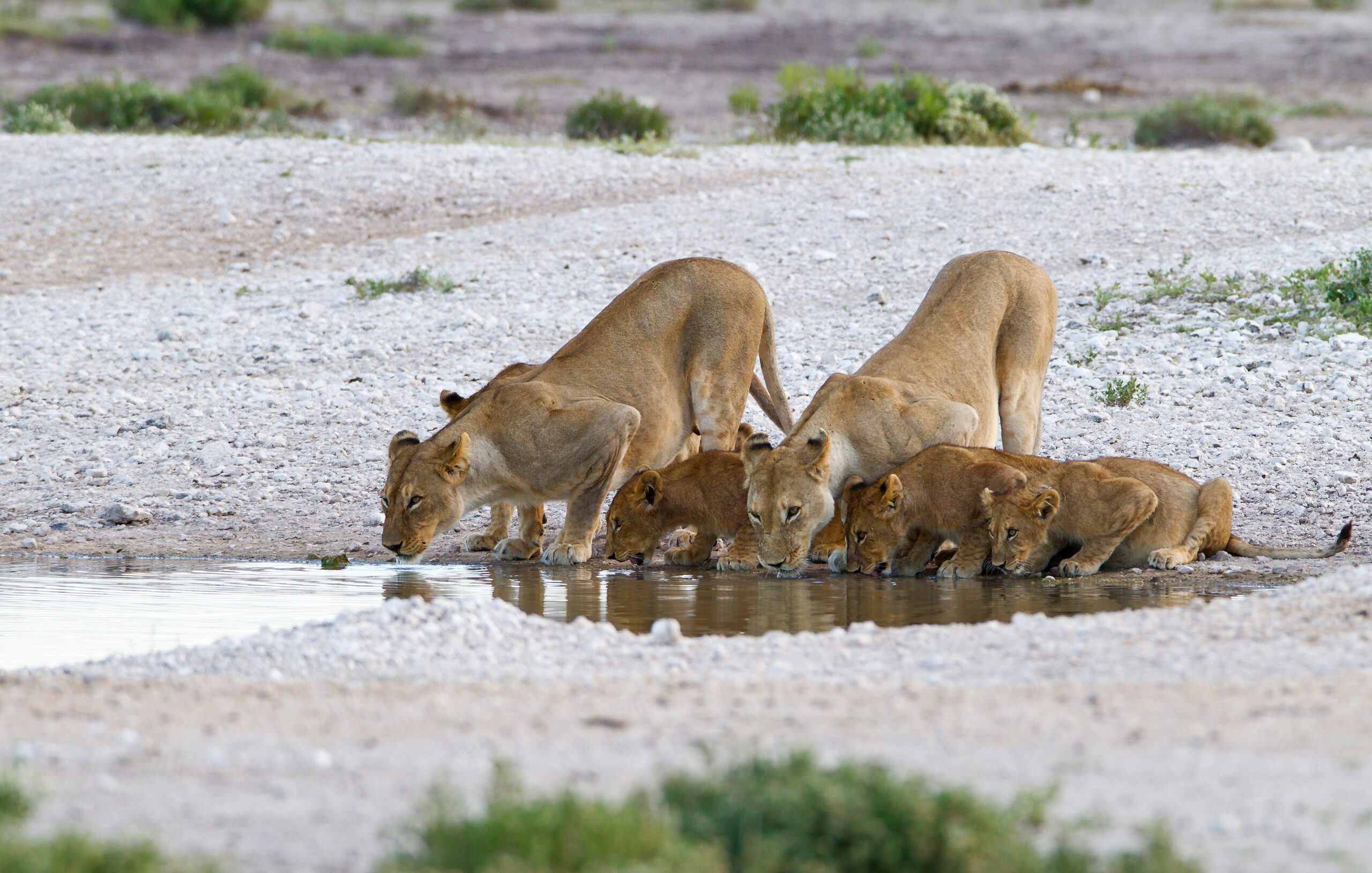 Etosha National Park is een van de grootste en meest iconische wildparken van Afrika, beroemd om zijn uitgestrekte zoutpan die zelfs vanuit de ruimte zichtbaar is. In het droge seizoen trekken talloze dieren naar de drinkplaatsen rond de pan: van elegante giraffen en imposante olifanten tot grote kuddes zebra’s en springbokken. Roofdieren als leeuwen, cheeta’s en hyena’s sluipen langs de randen, terwijl de lucht gevuld is met het gekwetter van kleurrijke vogels. De open vlaktes bieden onovertroffen fotografiemogelijkheden, vooral bij zonsondergang wanneer het licht zacht over het landschap strijkt.