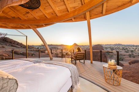 Een luxe lodge op een privéreservaat van 9.000 hectare, slechts 30 minuten van Windhoek. De ronde hutten zijn geïnspireerd op traditionele Owambo-architectuur en combineren natuurlijke materialen met verfijnde inrichting. Vanaf je privéterras kijk je uit over de savanne waar zebra’s, giraffen en oryxen grazen. Faciliteiten zijn onder meer een infinity pool, spa en uitstekende keuken.